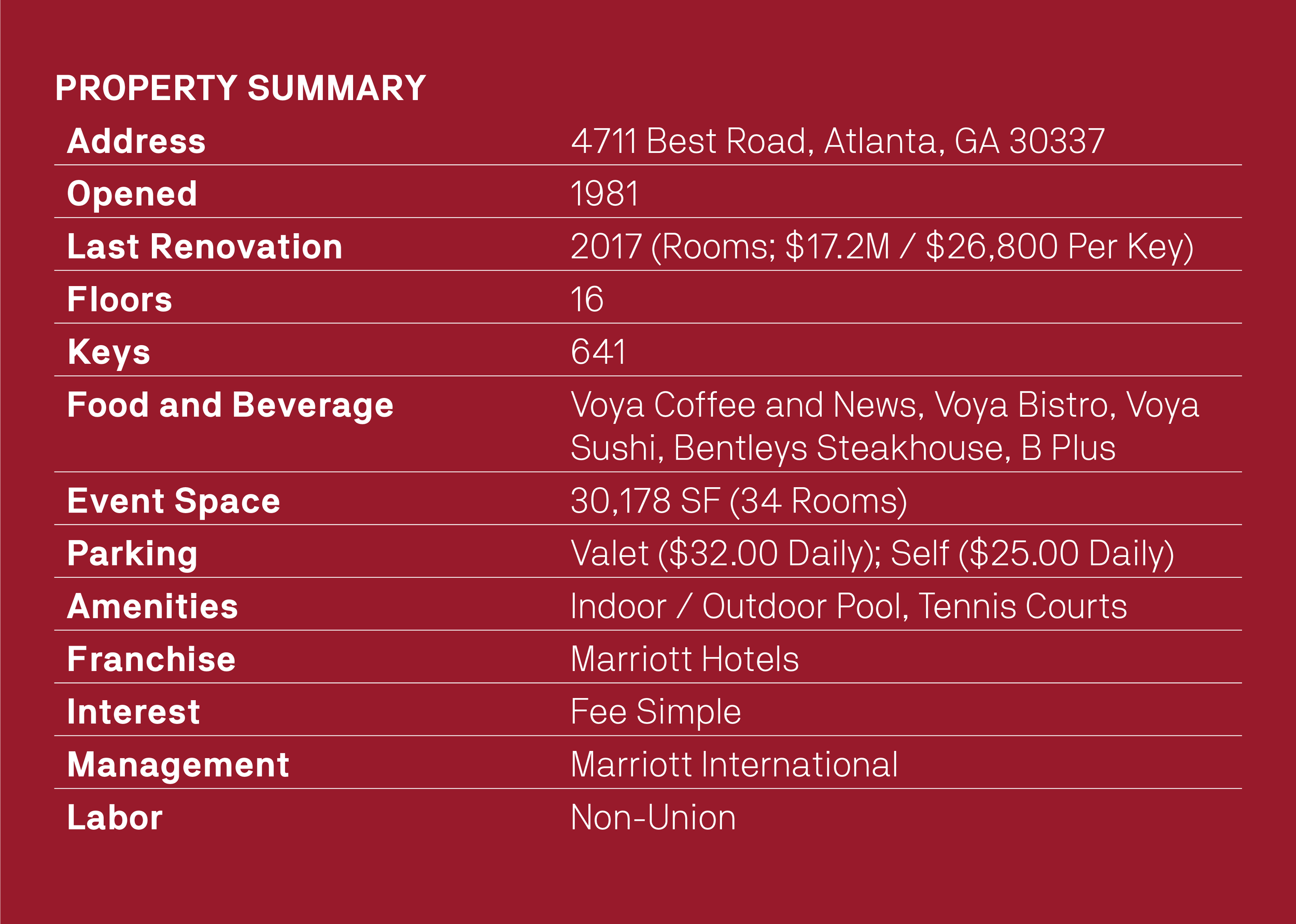 Hodges Ward Elliott has been exclusively retained by Venice Harbor Capital (“VHC” or the “Sponsor”) to arrange up to 65% loan-to-cost (“LTC”) financing ($37,050,000 / $57,800 per key) on a fixed or floating rate basis to finance the acquisition of the Atlanta Airport Marriott (the “Hotel” or the “Property”). The Sponsor plans to execute approximately $18 million in capital improvements, which will be capitalized with $7 million funded pari-passu (preferred) or via up-front reserves and the balance of the FF&E Reserve that is transferred with the purchase. The current balance of the FF&E Reserve is approximately $11.5 million and will continue to accrue through closing and post-closing, providing future capital expenditure support.